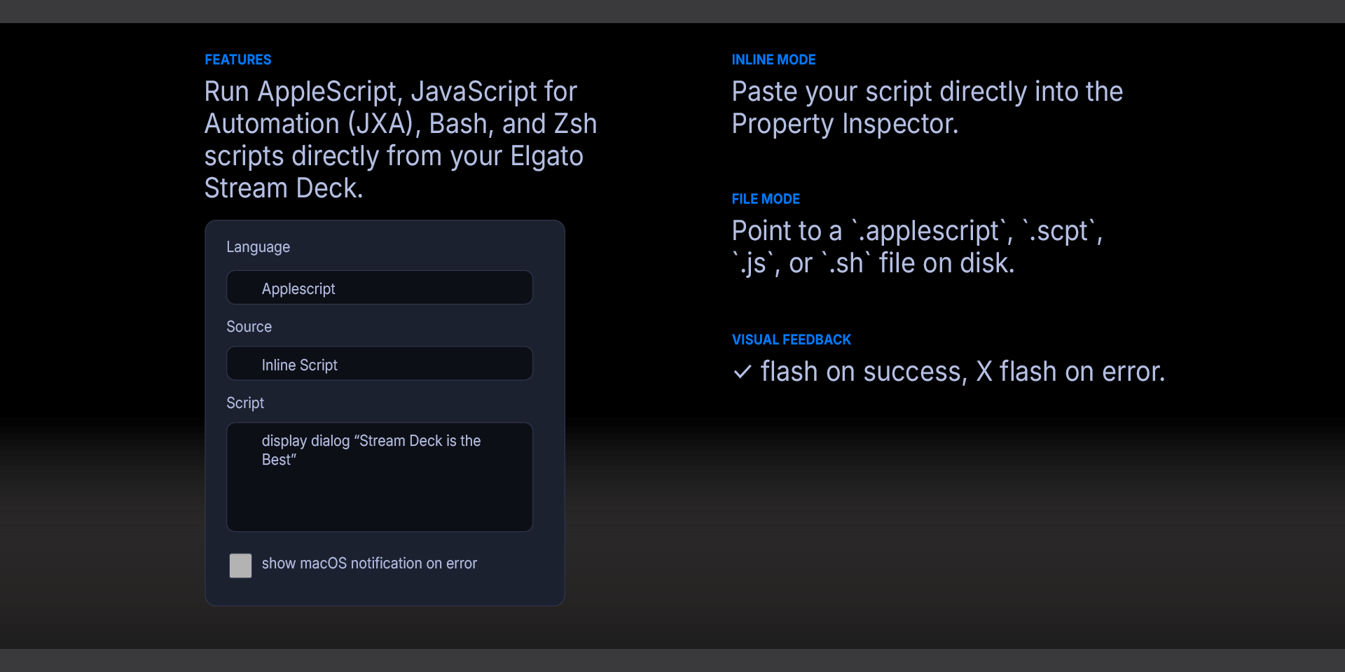 Run AppleScript, JavaScript for Automation (JXA), Bash, and Zsh scripts directly from your Elgato Stream Deck.