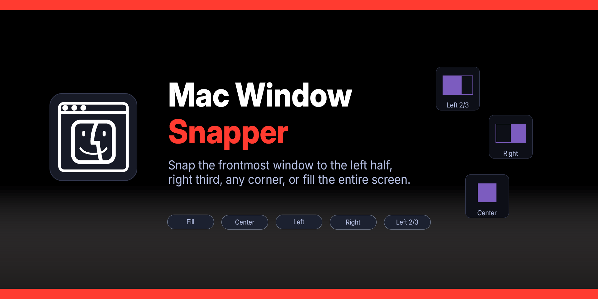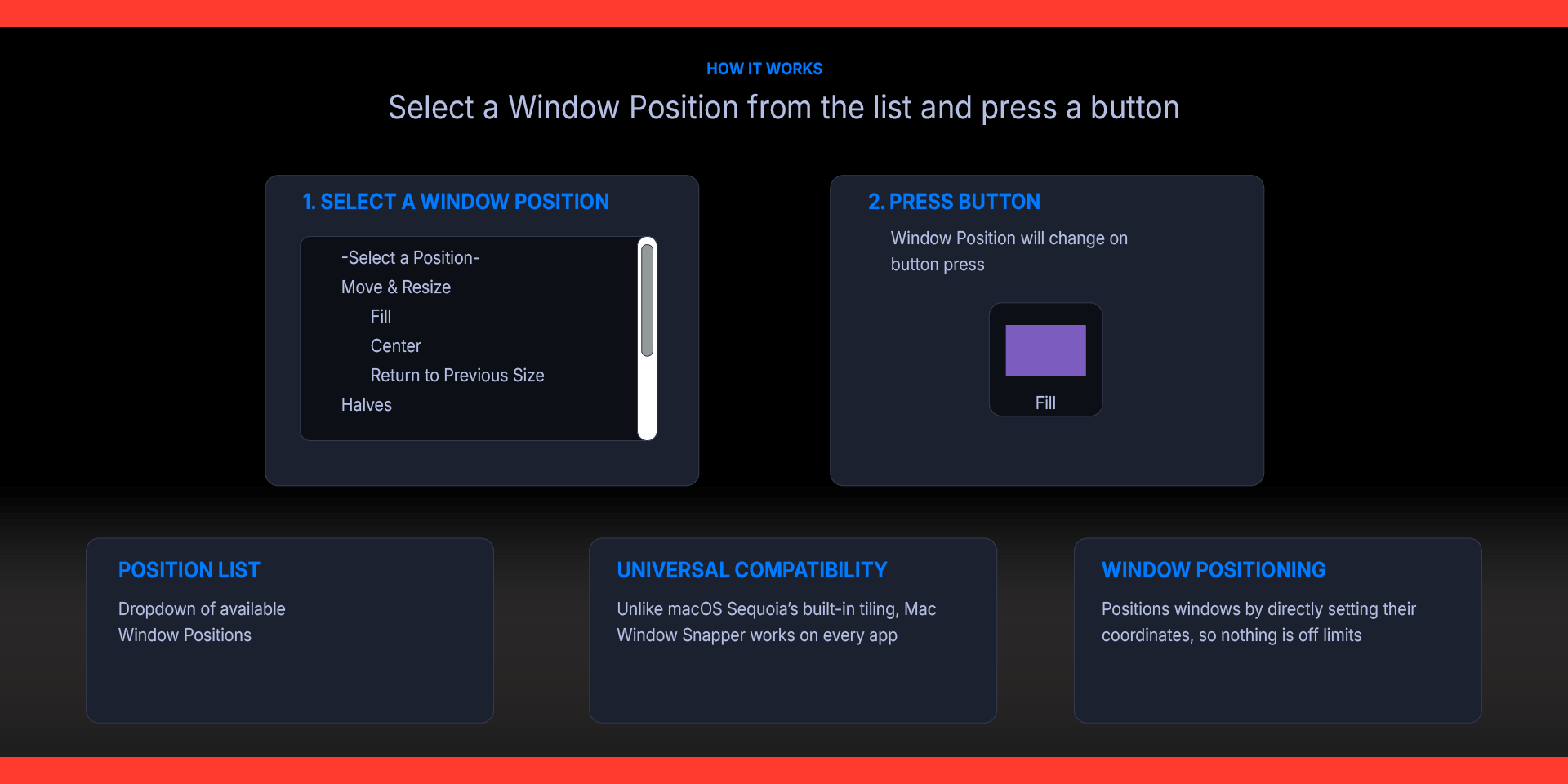 Mac Window Snapper positions windows by directly setting their coordinates and dimensions through macOS Accessibility (System Events). When you press a key: